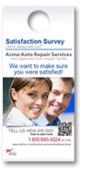 The mirror hanger is very affective after a vehicle has been serviced and of course you want to know how your customers felt about their experience. The mirror hanger can be designed with information for the customer to follow to access a customer satisfaction survey on the services received. It can also be used as a coupon for future services, access to any type of information from free movie tickets to direct access to a specific web page offering special information for their eyes only via a QR code or hyper link.